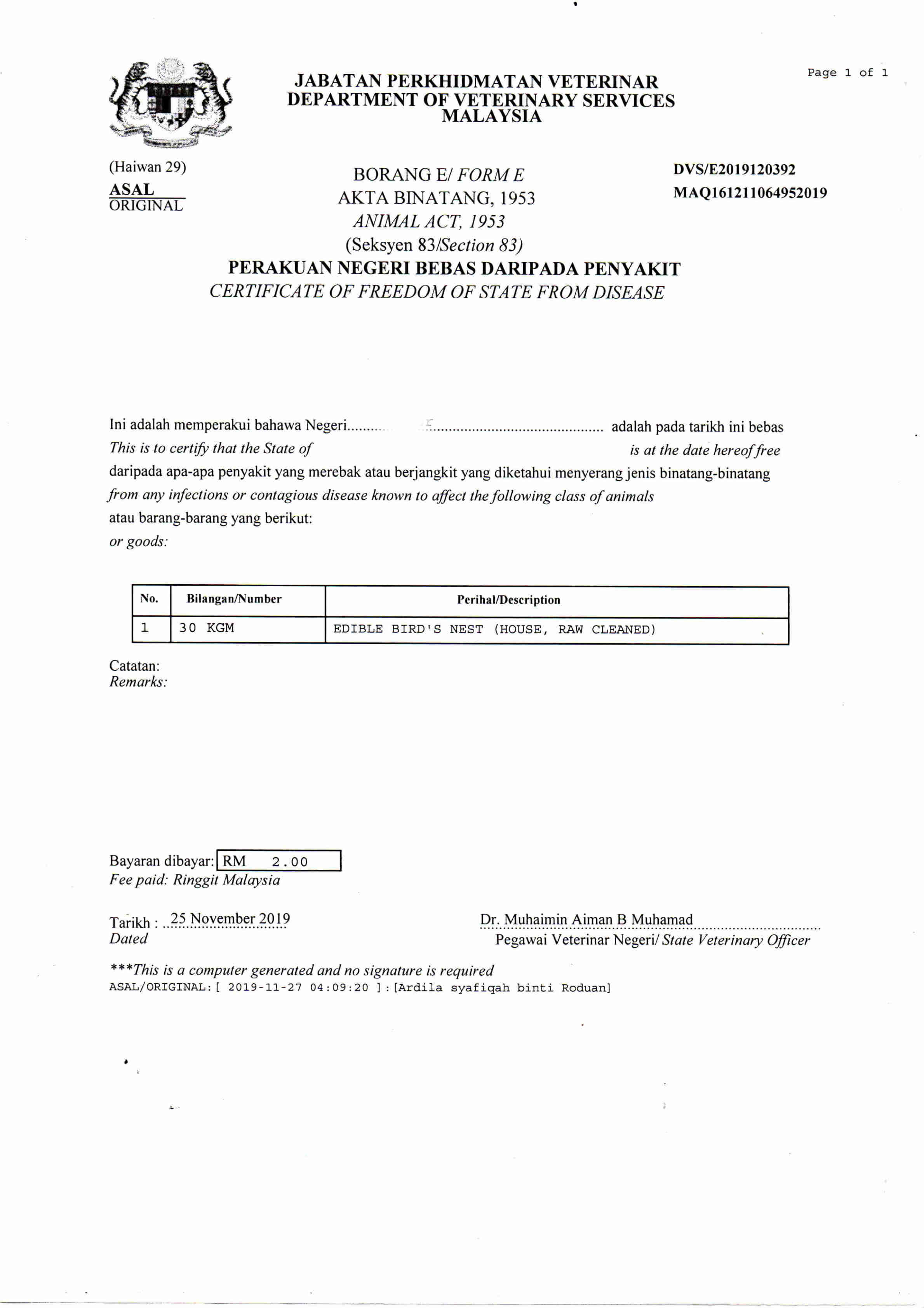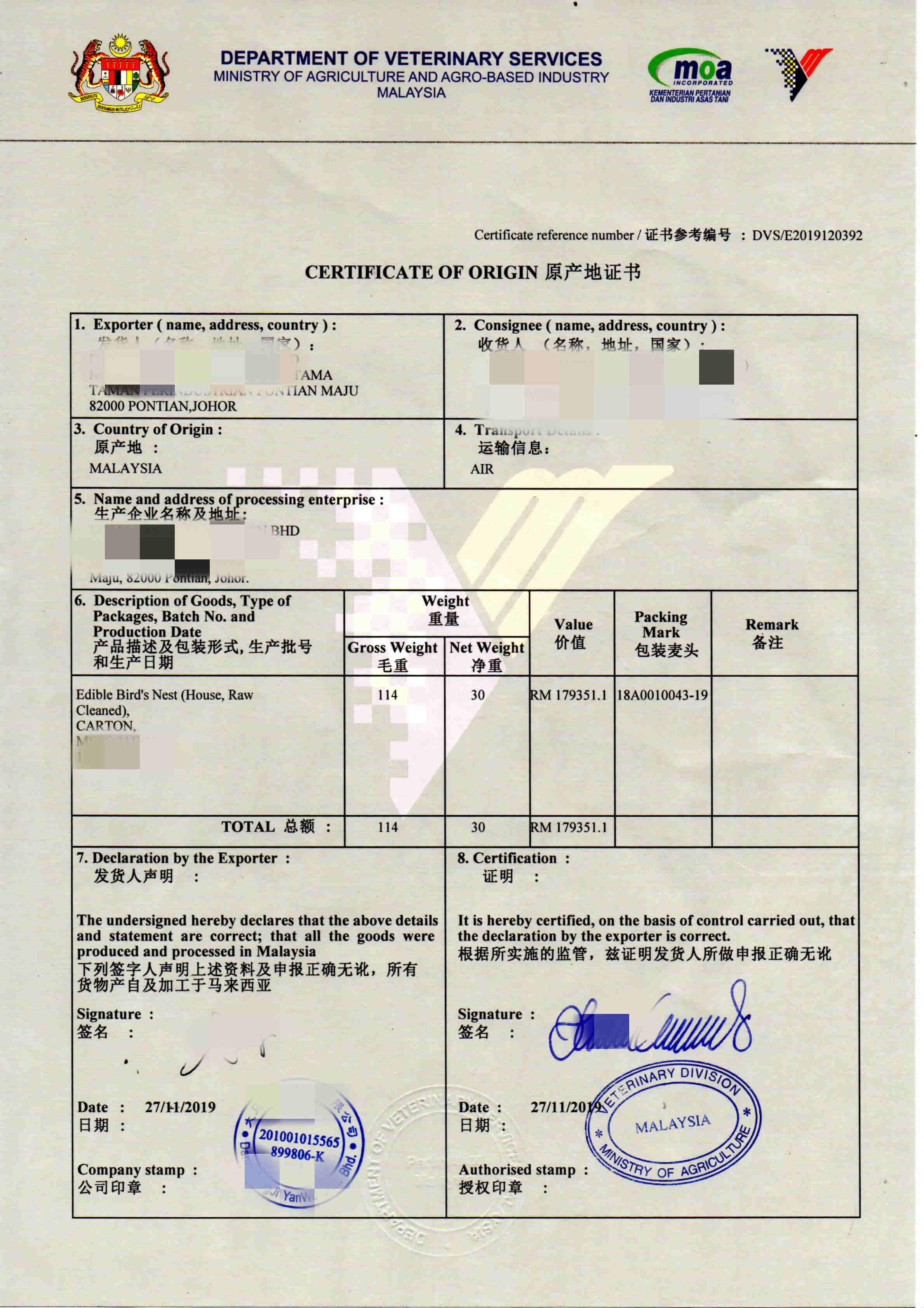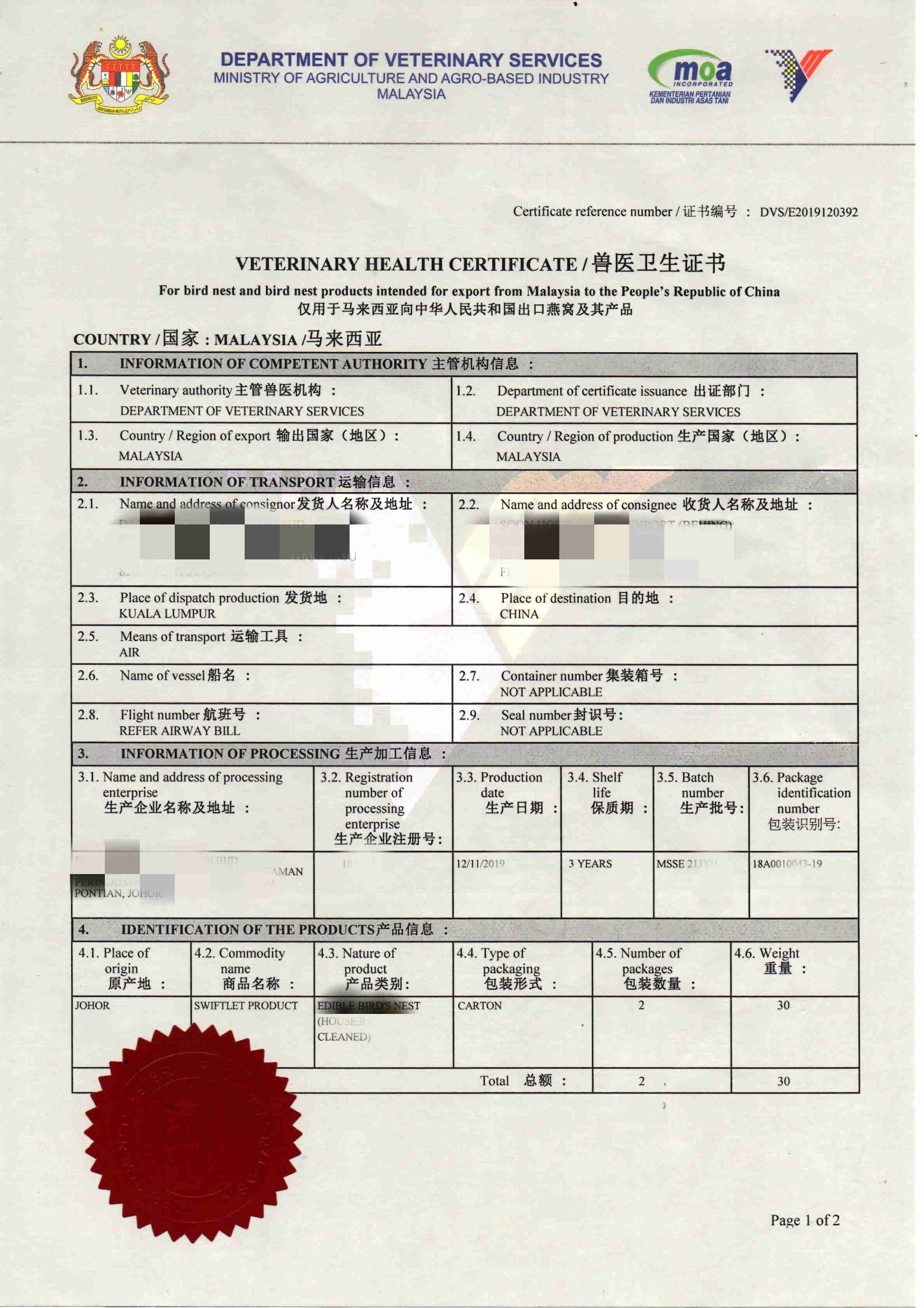 3. 獸醫(yī)產(chǎn)地證(發(fā)貨人提供)