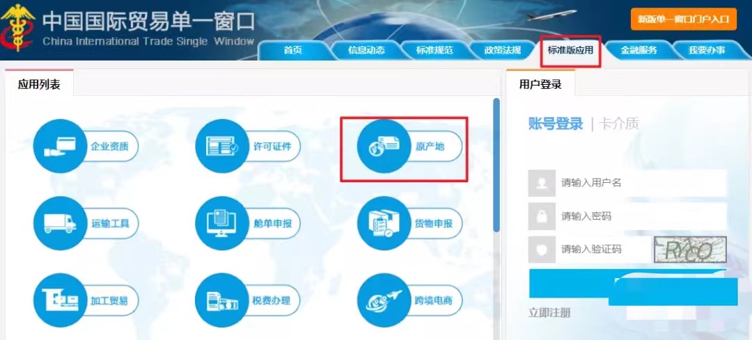 注冊或登陸成功后,進入“標準版應(yīng)用”版面中的“原產(chǎn)地”模塊中的“原產(chǎn)地綜合服務(wù)平臺”,進行企業(yè)備案申請。