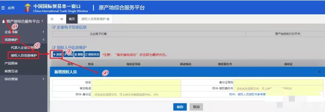 點擊菜單中的“信息維護”→“授權(quán)人員信息維護”→“+新增”,填報授權(quán)人員信息: