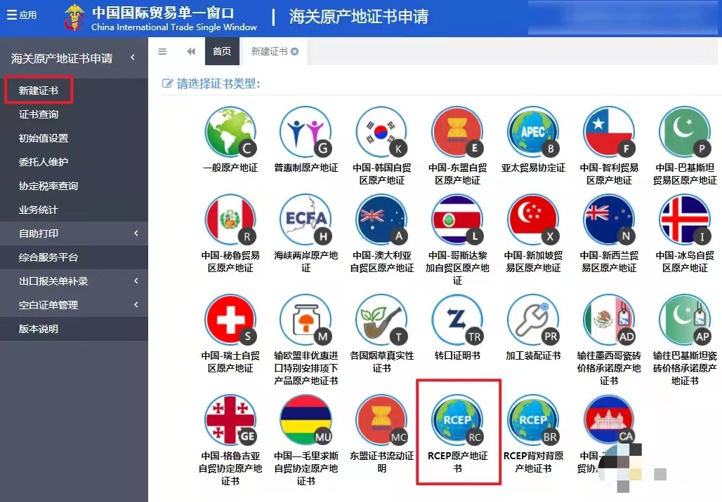 點擊左側(cè)菜單欄“新建證書”,選擇“RCEP原產(chǎn)地證書”。