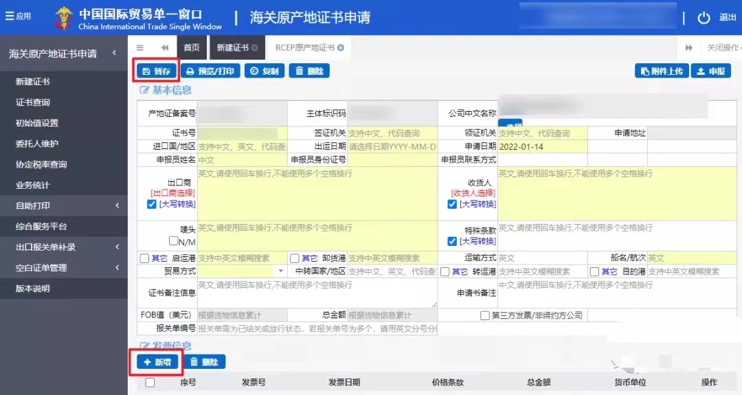 基本信息錄入完成后,點擊“暫存”保存基本信息。發(fā)票信息處,點擊“新增”。