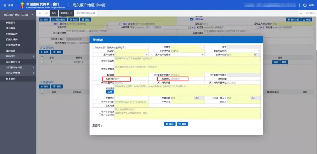 注意:圈紅的“包裝件數(shù)”“包裝單位”字段雖為白色,也是必填項?!柏浳锩钄?shù)”字段可以不用手動錄入,在其他字段錄入完成后點擊“生成”即可。