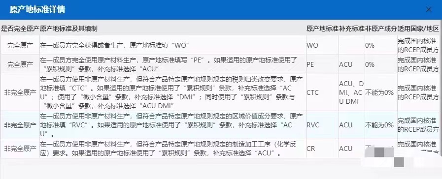 RCEP原產(chǎn)地標準填報對照表